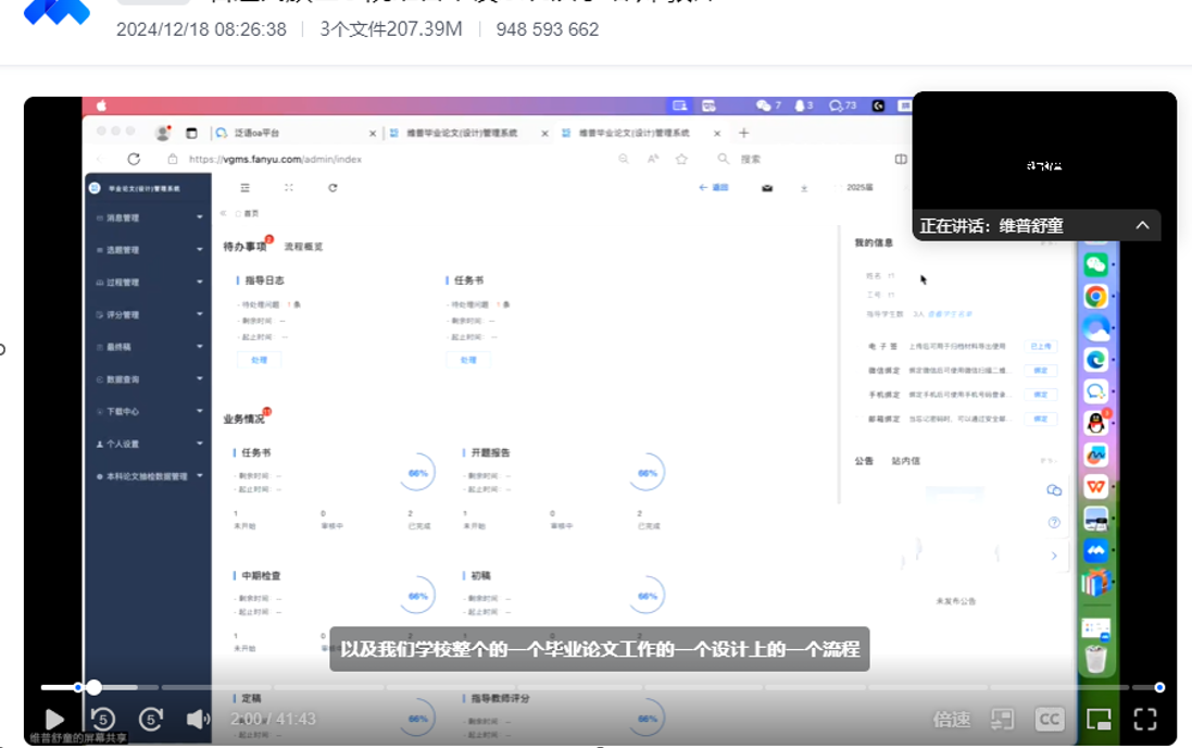本次线上会议共有两场培训,分别是教师专场、学生专场。教师专场培训主要由系统平台技术员舒童工程师主讲。会上,舒童老师详细介绍了毕业论文管理系统的功能与操作流程,并针对不同角色老师在论文管理、论文指导中可能遇到的问题进行了深入解析,现场解答了老师们提出的各种疑问。学生专场培训首先由系统平台培训师肖丹老师讲授,她用生动的案例指导学生如何智能选题、精准把握研究方向的技巧,如何高效开题、检索文献、选择研究方法,强调了毕业论文格式规范、引用标准及学术诚信的重要性。随后,舒童老师向2025届的毕业生们展示了毕业论文管理系统学生端的各项功能,并通过实际操作演示,让学生们能够熟练地使用该系统来完成毕业论文的相关工作。